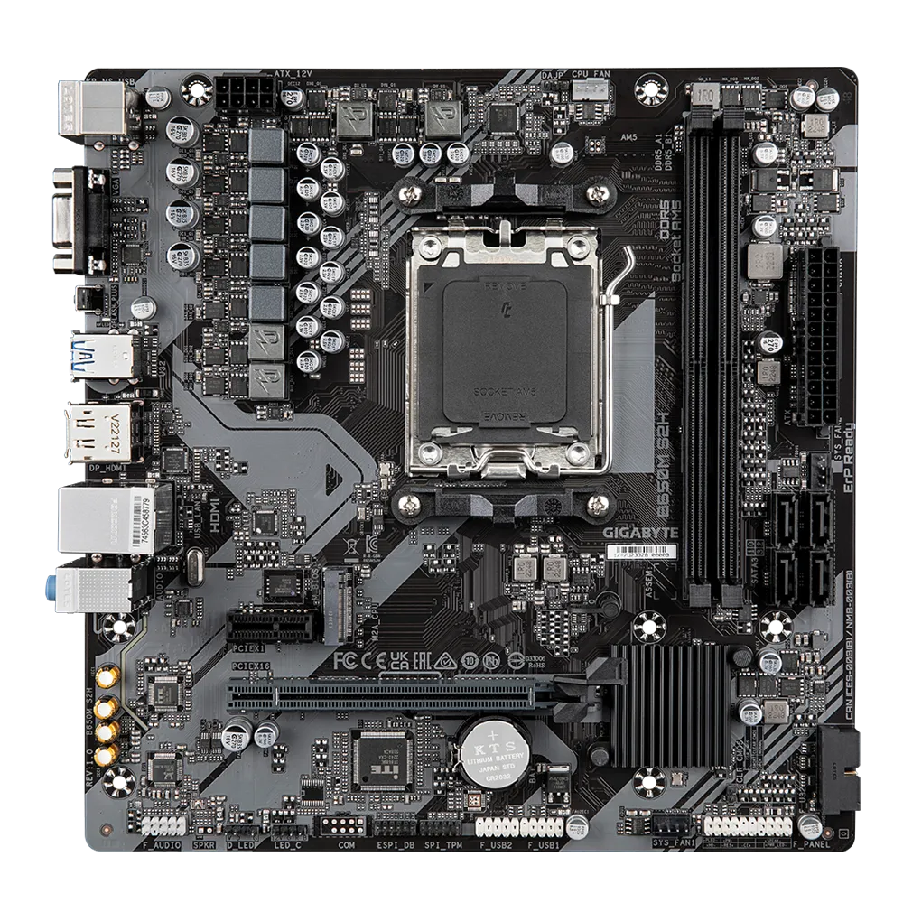 Piegāde visā Latvijā un iespēja saņemt pasūtījumu izsniegšanas punktā. Ērti norēķinu veidi. Iespēja apmaksat tieši interneta veikalā, ar karti vai skaidrā naudā preces saņemšanas punkta. Detalizēts preču apraksts un salīdzināšanas iespēja. Populārākie zīmoli no pasaules ražotājiem. 107,20 € Preces ID: 1219 Pamatplate GIGABYTE B650 B650M S2H Brown (B650M S2H 1.0) PamataRažotājs ........................................................................................................................................................................................................ Ražotāja kods ........................................................................................................................................................................................................ B650M S2H 1.0 Ligzda ........................................................................................................................................................................................................ AM5 Mikroshēmu kopa (Chipset) ........................................................................................................................................................................................................ AMD B650 AtmiņaAtmiņas veids ........................................................................................................................................................................................................ DDR5 Atmiņas slotu skaits ........................................................................................................................................................................................................ 2 Diska kontrolieriSATA kontrolieris ........................................................................................................................................................................................................ 4 x SATA-III (6 Gb/s) RAID atbalsts ........................................................................................................................................................................................................ 0, 1, 10 Paplašināšanas slotiPaplašināšanas sloti ........................................................................................................................................................................................................ PCI-E 4.0 x16, PCIe 3.0 x1, PCI-E M.2 M.2. slotu veids ........................................................................................................................................................................................................ 1 x M.2 connector (M2A_CPU), integrated in the CPU, supporting Socket 3, M key, type 2580 SSDs: