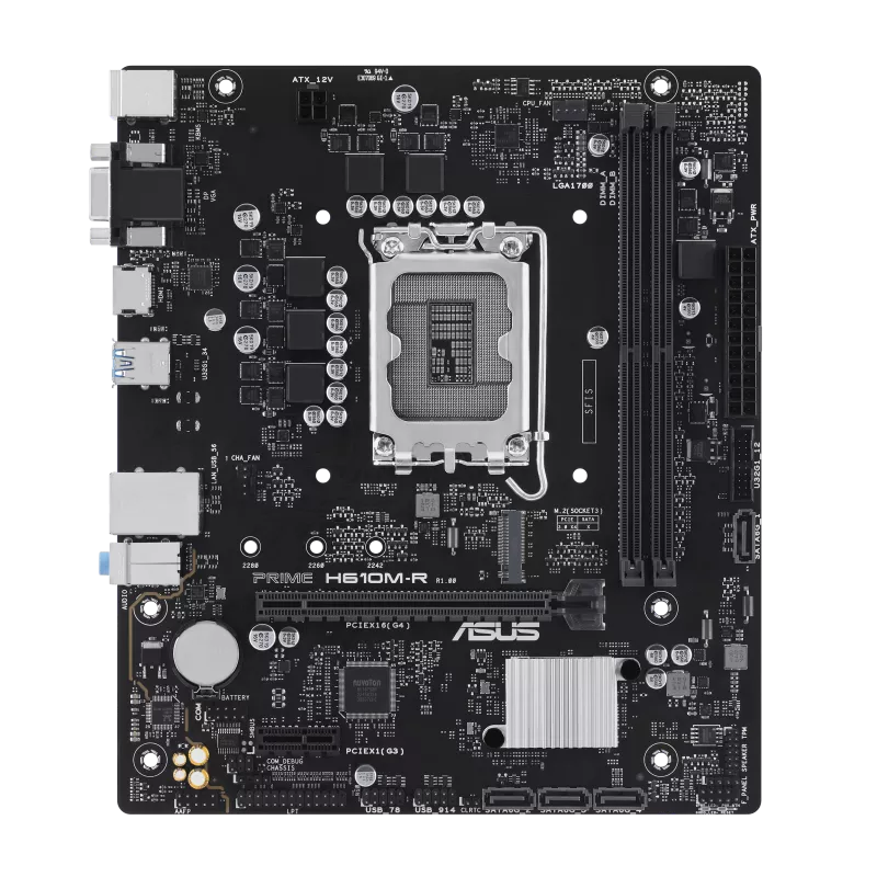 Piegāde visā Latvijā un iespēja saņemt pasūtījumu izsniegšanas punktā. Ērti norēķinu veidi. Iespēja apmaksat tieši interneta veikalā, ar karti vai skaidrā naudā preces saņemšanas punkta. Detalizēts preču apraksts un salīdzināšanas iespēja. Populārākie zīmoli no pasaules ražotājiem. 72,00 € Preces ID: 1891 Pamatplate ASUS PRIME H610M-R-SI (90MB1GL0-M0ECY0) PamataRažotājs ........................................................................................................................................................................................................ Ražotāja kods ........................................................................................................................................................................................................ 90MB1GL0-M0ECY0 Ligzda ........................................................................................................................................................................................................ LGA 1700 Mikroshēmu kopa (Chipset) ........................................................................................................................................................................................................ Intel H610 AtmiņaAtmiņas veids ........................................................................................................................................................................................................ DDR5 Atmiņas slotu skaits ........................................................................................................................................................................................................ 2 Diska kontrolieriSATA kontrolieris ........................................................................................................................................................................................................ 4 x SATA-III (6 Gb/s) Paplašināšanas slotiPaplašināšanas sloti ........................................................................................................................................................................................................ PCI-E 4.0 x16, PCIe 3.0 x1, PCI-E M.2 M.2. slotu veids ........................................................................................................................................................................................................