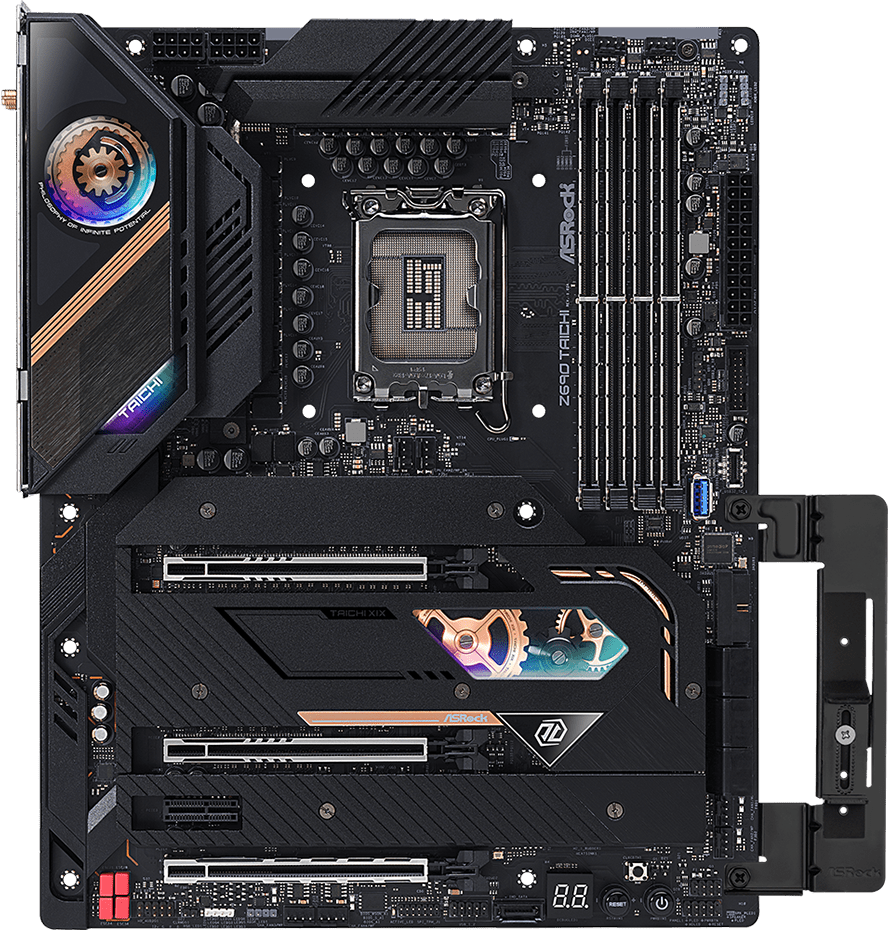 Piegāde visā Latvijā un iespēja saņemt pasūtījumu izsniegšanas punktā. Ērti norēķinu veidi. Iespēja apmaksat tieši interneta veikalā, ar karti vai skaidrā naudā preces saņemšanas punkta. Detalizēts preču apraksts un salīdzināšanas iespēja. Populārākie zīmoli no pasaules ražotājiem. 39.070,00 € Preces ID: 423961 Pamatplate ASRock Z690 Taichi PamataRažotājs ........................................................................................................................................................................................................ Ražotāja kods ........................................................................................................................................................................................................ Z690 Taichi Ligzda ........................................................................................................................................................................................................ LGA 1700 Mikroshēmu kopa (Chipset) ........................................................................................................................................................................................................ Intel Z690 AtmiņaAtmiņas veids ........................................................................................................................................................................................................ DDR5 Atmiņas slotu skaits ........................................................................................................................................................................................................ 4 Diska kontrolieriSATA kontrolieris ........................................................................................................................................................................................................ 6 x SATA-III (6 Gb/s) RAID atbalsts ........................................................................................................................................................................................................ 0, 1, 5, 10 Paplašināšanas slotiPaplašināšanas sloti ........................................................................................................................................................................................................ 2 x PCI-E 5.0 x16, PCI-E 4.0 x16, PCI-E x1, 4 x PCI-E M.2 M.2. slotu veids ........................................................................................................................................................................................................ - Key M, 2280 (PCIe Gen4x4); - Key M, 2242/2260/2280 (PCIe Gen4x4); - Key M, 2230/2242/2260/2280 (SATA3 & PCIe Gen3x2); - Key E, 2230, for WiFi/BT PCIe WiFi module and Intel CNVi (built-in WiFi/BT). Atbalstītie PCI-Express režīmi ........................................................................................................................................................................................................ x16, x8/x8, x8/x8/x4 Audio/VideoIntegrētais video ........................................................................................................................................................................................................ jā (ja tiek izmantots procesors ar video kodolu) Skaņa ........................................................................................................................................................................................................ 8 kanāli (7.1) Audio kontrolieris ........................................................................................................................................................................................................ Realtek ALC1220 TīklsTīkla saskarne ........................................................................................................................................................................................................ Gigabit Ethernet (10/100/1000 Mbps), 2.5 Gigabit Ethernet (100/1000/2500 Mbps), Wi-Fi, Bluetooth Tīkla kontrolieris ........................................................................................................................................................................................................ Intel I219V/Killer E3100G SaskarnesLigzdas aizmugurējā panelī ........................................................................................................................................................................................................ 4 x USB 3.2 Gen1, 2 x USB 3.2 Gen2, HDMI, 2 x Thunderbolt 4/USB-C, 2 x RJ-45, S/PDIF (optiskais) Barošanas apakšsistēmas radiators (mosfeti) ........................................................................................................................................................................................................ jā PapilduLigzdas korpusa ventilatoru pieslēgšanai ........................................................................................................................................................................................................ 4 x 4-pin ATX 12 V barošanas ligzda ........................................................................................................................................................................................................ 2 x 8-pin Iekšējās USB pieslēgvietas platē ........................................................................................................................................................................................................ 2 x USB 2.0, 3 x USB 3.2 Gen1, USB 3.2 Gen2x2 Type-C ARGB 5V savienotāji uz plates ......................................................................................