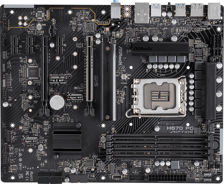 Piegāde visā Latvijā un iespēja saņemt pasūtījumu izsniegšanas punktā. Ērti norēķinu veidi. Iespēja apmaksat tieši interneta veikalā, ar karti vai skaidrā naudā preces saņemšanas punkta. Detalizēts preču apraksts un salīdzināšanas iespēja. Populārākie zīmoli no pasaules ražotājiem. 14.220,00 € Preces ID: 433795 Pamatplate ASRock H670 PG Riptide PamataRažotājs ........................................................................................................................................................................................................ Ražotāja kods ........................................................................................................................................................................................................ H670 PG Riptide Ligzda ........................................................................................................................................................................................................ LGA 1700 Mikroshēmu kopa (Chipset) ........................................................................................................................................................................................................ Intel H670 AtmiņaAtmiņas veids ........................................................................................................................................................................................................ DDR4 Atmiņas slotu skaits ........................................................................................................................................................................................................ 4 Diska kontrolieriSATA kontrolieris ........................................................................................................................................................................................................ 4 x SATA-III (6 Gb/s) RAID atbalsts ........................................................................................................................................................................................................ 0, 1, 5, 10 Paplašināšanas slotiPaplašināšanas sloti ........................................................................................................................................................................................................ PCI-E 5.0 x16, PCI-E 4.0 x16, 3 x PCI-E x1, 4 x PCI-E M.2 M.2. slotu veids ........................................................................................................................................................................................................ - Key M, 2260/2280 (PCIe Gen4x4); - Key M, 2242/2260/2280 (PCIe Gen4x4); - Key M, 2260/2280/22110 (SATA & PCIe Gen4x4); - Key E, support WiFi/BT PCIe WiFi type 2230 module and Intel CNVi (built-in WiFi/BT). Atbalstītie PCI-Express režīmi ........................................................................................................................................................................................................ x16/x4 Audio/VideoIntegrētais video ........................................................................................................................................................................................................ jā (ja tiek izmantots procesors ar video kodolu) Skaņa ........................................................................................................................................................................................................ 8 kanāli (7.1) Audio kontrolieris ........................................................................................................................................................................................................ Realtek ALC897 TīklsTīkla saskarne ........................................................................................................................................................................................................ Gigabit Ethernet (10/100/1000 Mbps) Tīkla kontrolieris ........................................................................................................................................................................................................ Intel I219V SaskarnesLigzdas aizmugurējā panelī ........................................................................................................................................................................................................ PS/2, 2 x USB 2.0, 4 x USB 3.2 Gen1, USB 3.2 Gen2, USB 3.2 Gen2 Type-C, HDMI, DisplayPort, RJ-45 PapilduLigzdas korpusa ventilatoru pieslēgšanai ........................................................................................................................................................................................................ 4 x 4-pin ATX 12 V barošanas ligzda ........................................................................................................................................................................................................ 4-pin, 8-pin Iekšējās USB pieslēgvietas platē ........................................................................................................................................................................................................ 2 x USB 3.2 Gen1, USB 2.0, USB 3.2 Gen2x2 Type-C ARGB 5V savienotāji uz plates ........................................................................................................................................................................................................ 3 x 3-pin RGB 12V savienotāji uz plates ...........................................................................................................................................................................