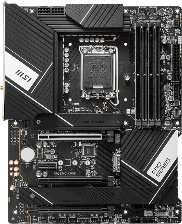 Piegāde visā Latvijā un iespēja saņemt pasūtījumu izsniegšanas punktā. Ērti norēķinu veidi. Iespēja apmaksat tieši interneta veikalā, ar karti vai skaidrā naudā preces saņemšanas punkta. Detalizēts preču apraksts un salīdzināšanas iespēja. Populārākie zīmoli no pasaules ražotājiem. 28.970,00 € Preces ID: 464375 Pamatplate MSI PRO Z790-A WIFI PamataRažotājs ........................................................................................................................................................................................................ Ražotāja kods ........................................................................................................................................................................................................ PRO Z790-A WIFI Ligzda ........................................................................................................................................................................................................ LGA 1700 Mikroshēmu kopa (Chipset) ........................................................................................................................................................................................................ Intel Z790 AtmiņaAtmiņas veids ........................................................................................................................................................................................................ DDR5 Atmiņas slotu skaits ........................................................................................................................................................................................................ 4 Diska kontrolieriSATA kontrolieris ........................................................................................................................................................................................................ 6 x SATA-III (6 Gb/s) RAID atbalsts ........................................................................................................................................................................................................ 0, 1, 5, 10 Paplašināšanas slotiPaplašināšanas sloti ........................................................................................................................................................................................................ PCI-E 5.0 x16, PCI-E 4.0 x16, PCI-E 3.0 x16, PCI-E x1, 4 x PCI-E M.2 M.2. slotu veids ........................................................................................................................................................................................................ - Key M, 22110/2280/2260/2242 (PCIe 4.0 x4); - Key M, 2280/2260/2242 (PCIe 4.0 x4); - Key M, 2280/2260/2242 (PCIe 4.0 x4 & SATA); - Key M, 2280/2260/2242 (PCIe 4.0 x4 & SATA). Atbalstītie PCI-Express režīmi ........................................................................................................................................................................................................ x16/x4/x1 Audio/VideoIntegrētais video ........................................................................................................................................................................................................ jā (ja tiek izmantots procesors ar video kodolu) Skaņa ........................................................................................................................................................................................................ 8 kanāli (7.1) Audio kontrolieris ........................................................................................................................................................................................................ Realtek ALC4080 TīklsTīkla saskarne ........................................................................................................................................................................................................ 2.5 Gigabit Ethernet (100/1000/2500 Mbps), Wi-Fi, Bluetooth Tīkla kontrolieris ........................................................................................................................................................................................................ Intel SaskarnesLigzdas aizmugurējā panelī ........................................................................................................................................................................................................ 2 x USB 2.0, 2 x USB 3.2 Gen1, 3 x USB 3.2 Gen2, USB 3.2 Gen2x2 Type-C, HDMI, DisplayPort, RJ-45, S/PDIF (optiskais) Barošanas apakšsistēmas radiators (mosfeti) ........................................................................................................................................................................................................ jā PapilduLigzdas korpusa ventilatoru pieslēgšanai ........................................................................................................................................................................................................ 6 x 4-pin ATX 12 V barošanas ligzda ........................................................................................................................................................................................................ 2 x 8-pin Iekšējās USB pieslēgvietas platē ........................................................................................................................................................................................................ 2 x USB 2.0, USB 3.2 Gen1, USB 3.2 Gen2 Type-C ARGB 5V savienotāji uz plates ...................................................................................................................................................
